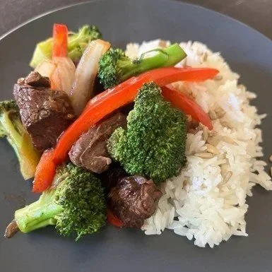 Chicken Stir Fry (Savory stir-fried chicken tossed with vegetables, ginger, garlic, and soy, served over rice)