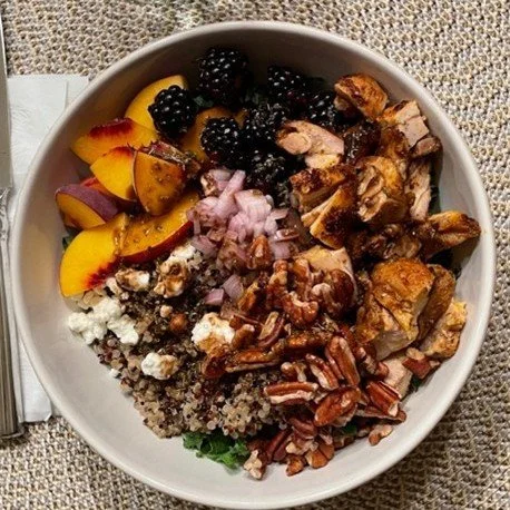 Summer Salad (fresh kale and quinoa salad with peaches, blueberries, mint, goat cheese, and honey-spiced chicken)