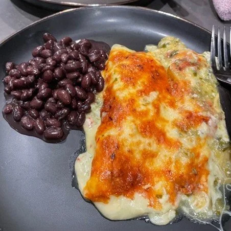 Enchiladas Verde (homemade salsa verde with tomatillos and serrano peppers drenching tortillas stuffed with chicken and topped with cheese)