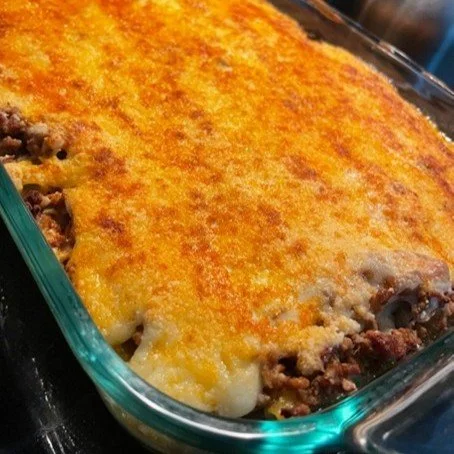 Pastitsio (Greek baked pasta layered with spiced ground beef and creamy parmesan béchamel)