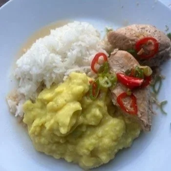 Asian style chicken with potato puree: Savory stir-fried chicken with ginger, garlic, spring onions, and red chili, served alongside buttery mashed potatoes with a hint of turmeric.